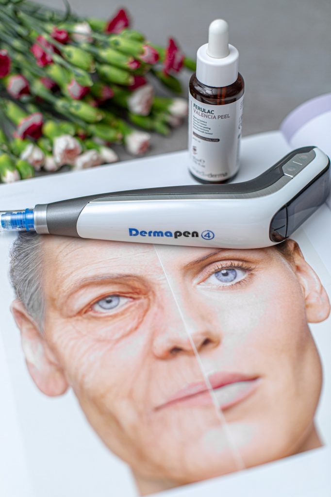 Dermapen 4 to zaawansowane technologicznie urządzenie wykorzystywane podczas zabiegu znanego jako mezoterapia mikroigłowa. Zabieg ten trwa około 40 minut i polega na nakłuwaniu skóry molibdenowymi igłami oraz dostarczaniu do jej głębszych warstw substancji aktywnych indywidualnie dobranych do potrzeb. To precyzyjna czynność w pełni kontrolowana przez osobę obsługującą sprzęt – może ona regulować zarówno głębokość wkłuć, jak i prędkość ich wykonywania. Pulsujące igły nakłuwają skórę w zakresie od 0,2 mm do 2,5 mm, a głębokość ta może być modyfikowana w trakcie trwania zabiegu. Przed przystąpieniem do zabiegu skóra jest znieczulana oczyszczana i dezynfekowana. W efekcie nakłuwania powstają liczne mikrourazy, co pobudza uruchomienie naturalnych skłonności regeneracyjnych. Aktywowanie procesów naprawczych skóry sprzyja odbudowie jej struktury.